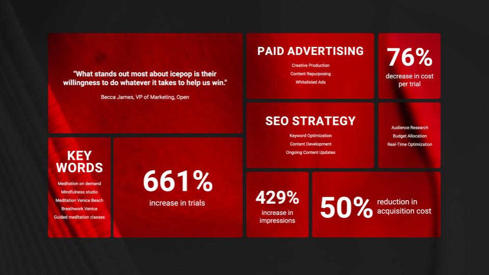 The collaborative partnership between Icepop and Open helped drive meaningful business growth. The right combination of media buying, paid social, and organic SEO helped Open reach and resonate with its audiences– driving more prospective users to start free trials and mindfulness journeys.